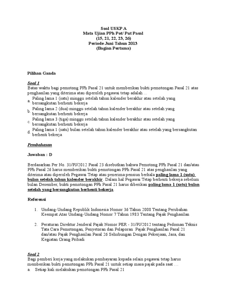 PPh BADAN dan SPT PPh BADAN - B I. Soal USKP A Mata Ujian PPh Pot Put Pasal 15 21 22 23 26 Periode Juni Tahun 2013 Bagian Pertama Pilihan Ganda Soal 1 Batas waktu bagi pemotong PPh Pasal 21 untuk memberikan bukti pemotongan Pasal 21 atas a. Pajak Internasional C.