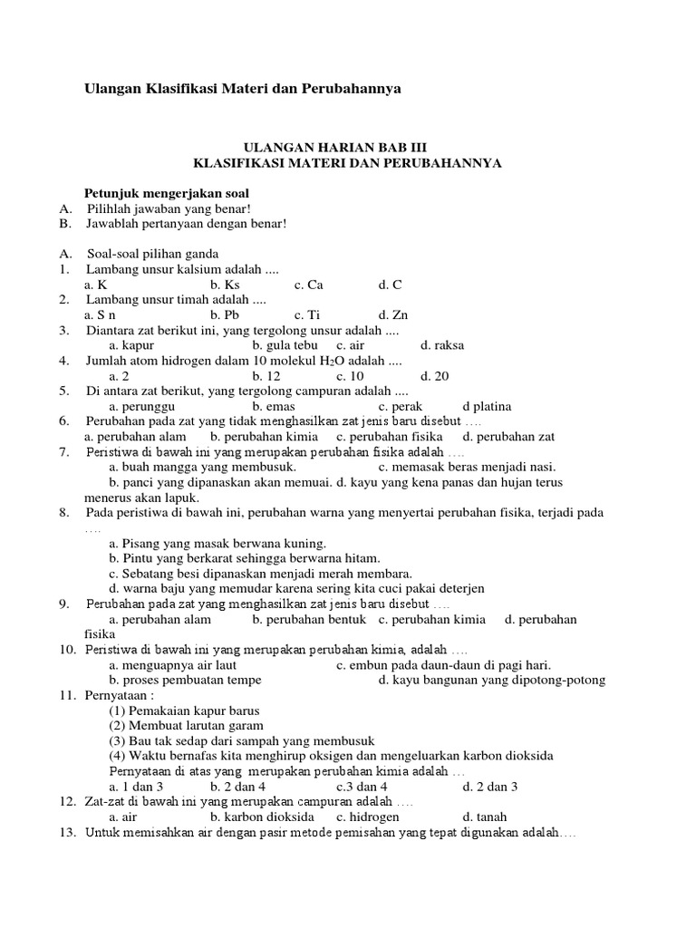 Soal Latihan Bab Materi Dan Perubahannya by Andrian Vernandes. Soal ipa kelas 7 semester 1 dan kunci jawaban kurikulum 2013 klasifikasi zat dan materi ditulis assyifa sabtu 17 november 2018 soal kimia smp klasifikasi zat dan materi.