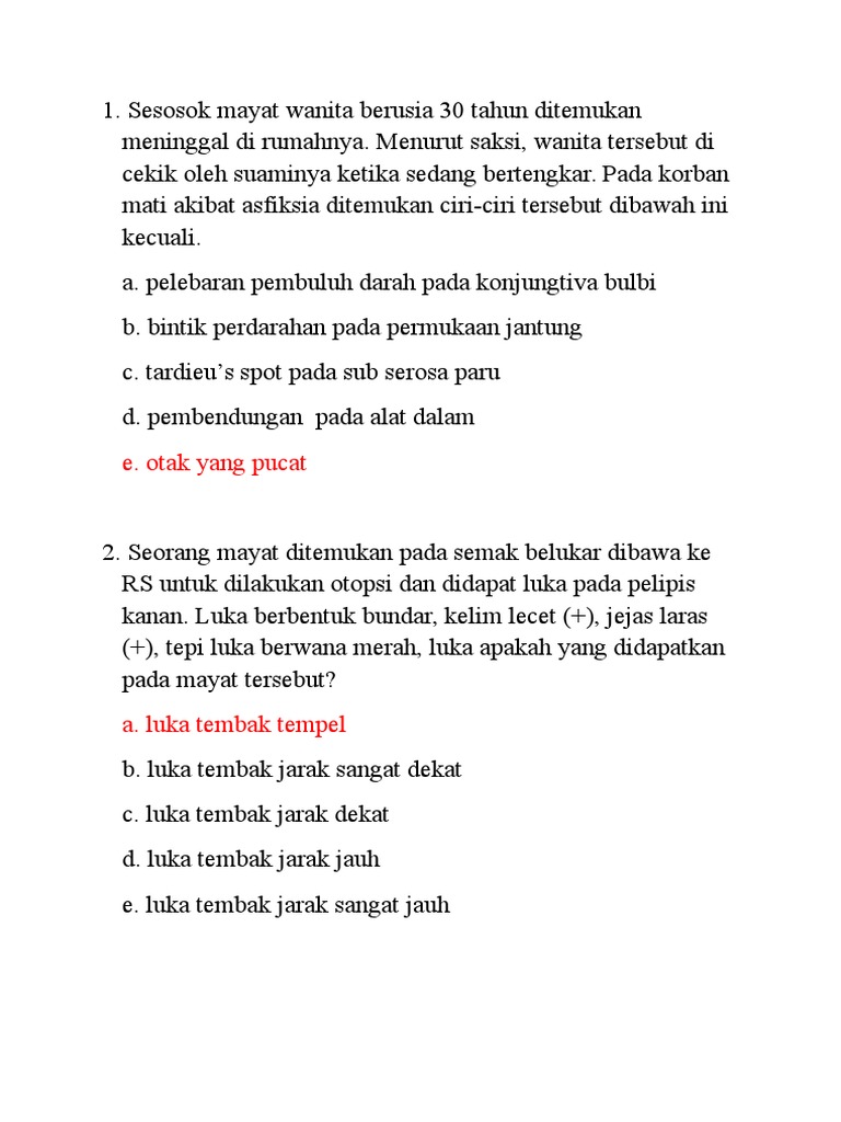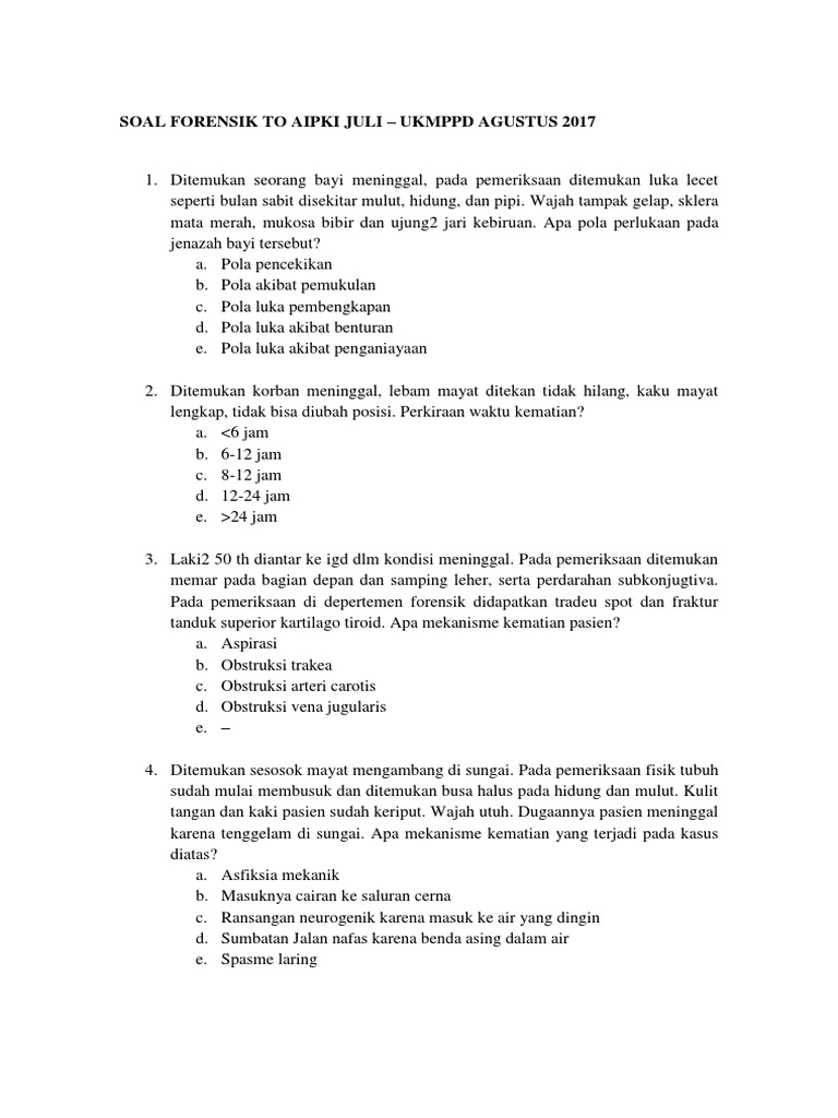 Soal-soal terbaru CBT UKMPPD Pembahasan disertai. Soal forensik tidak hanya menanyakan mengenai aspek kedokteran namun juga masalah hukum dan etika. Seorang perempuan 25 tahun datang dengan luka seperti luka bakar sejak 2 hari yang lalu.